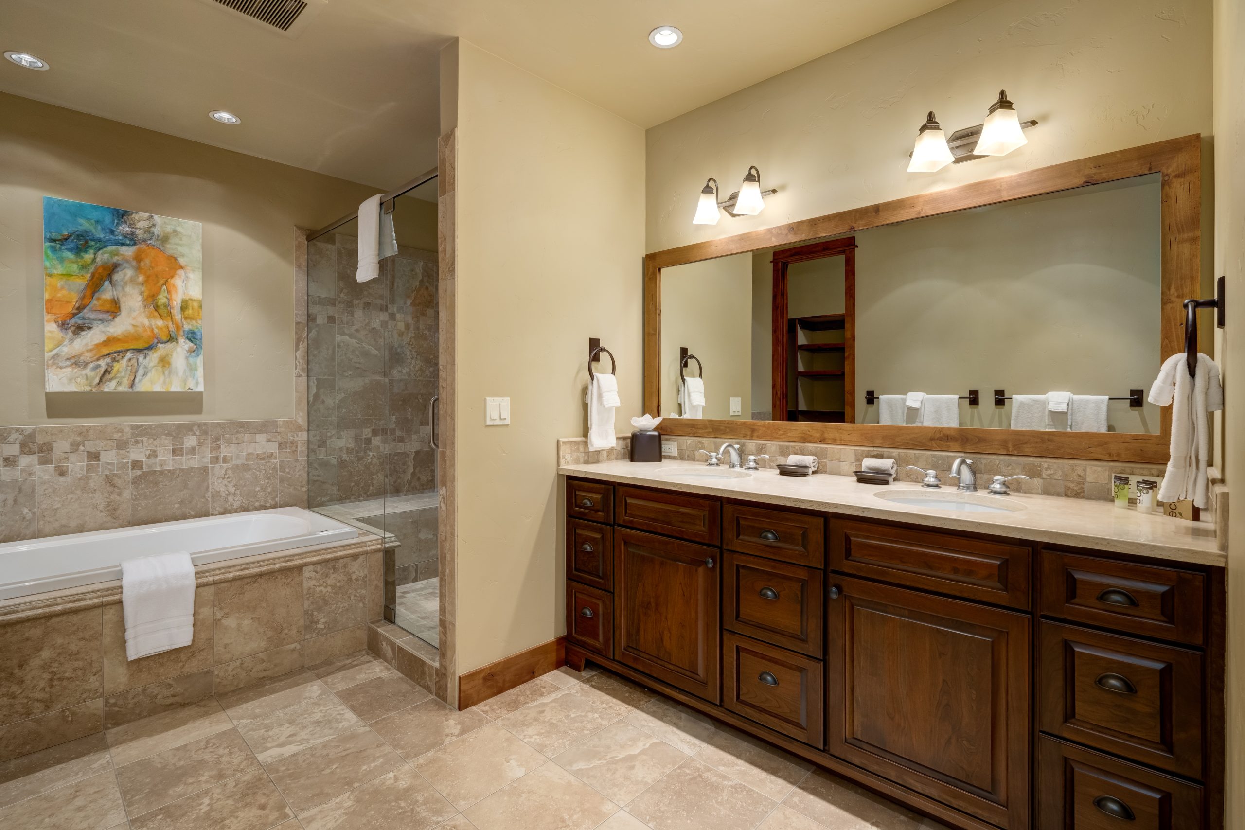 - Main-level master suite: You can organize your outfits in a walk-in closet and sleep peacefully in our main-level master suite. The room includes a gas fireplace and expansive windows with outdoor views. When it’s time to get refreshed, the en suite bathroom features a double split vanity, soaking tub, rain shower and heated floors for you to use.